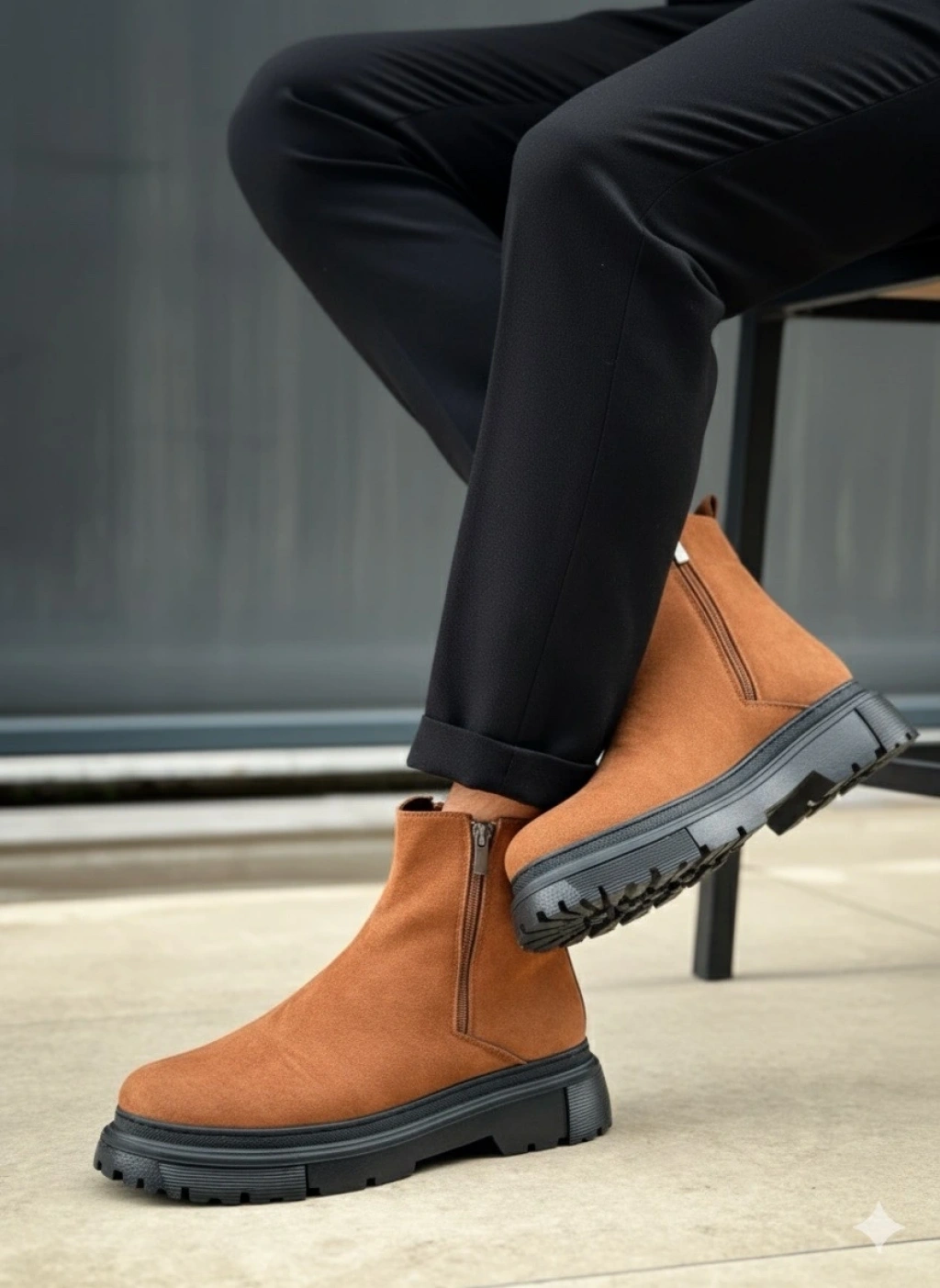 Ba0777 Süet Taba Siyah Taban Çift Fermuarlı Erkek Yarım Bilek Bot