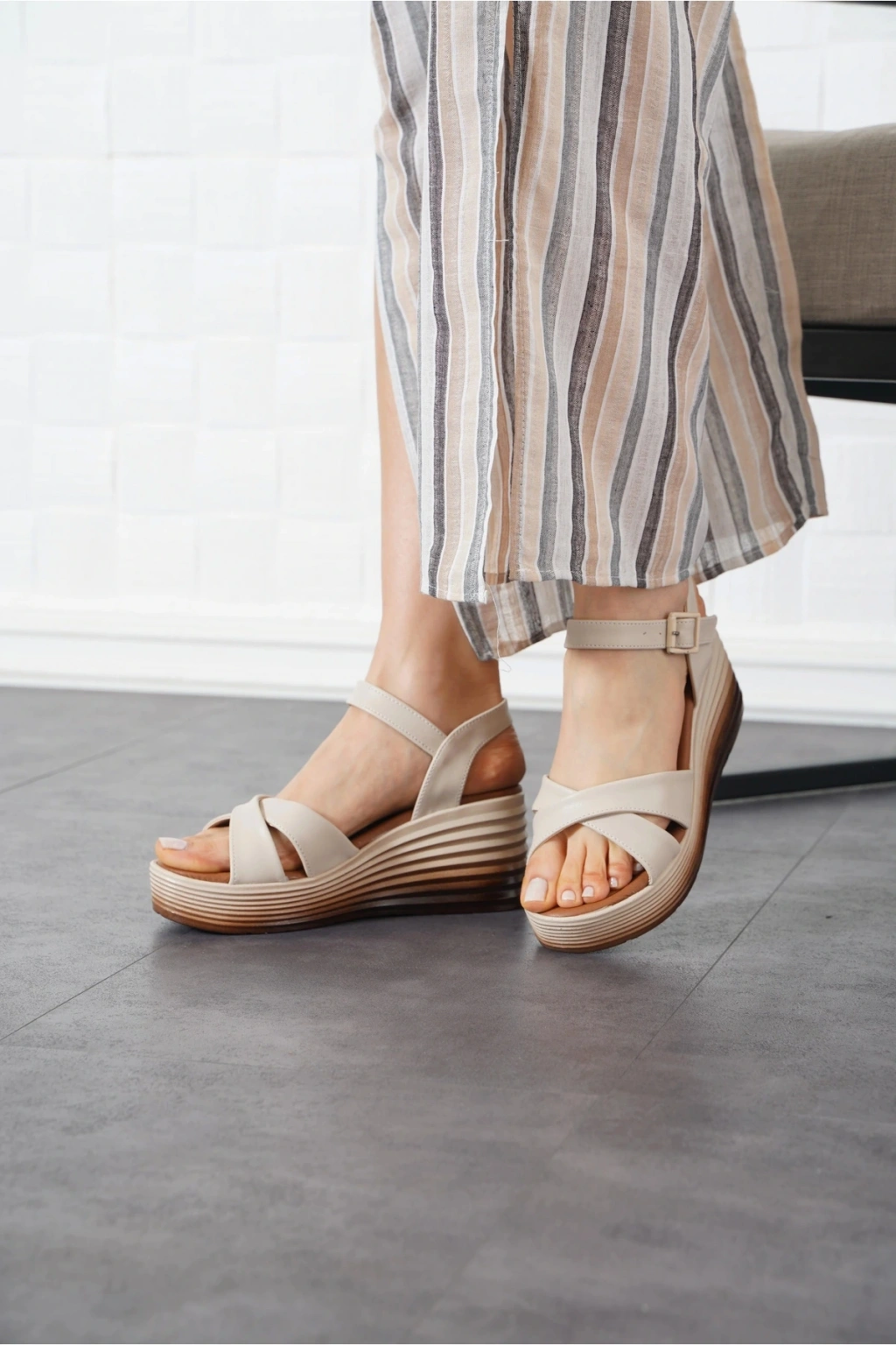 Kadın Bej Çapraz Dolgu Topuklu Sandalet