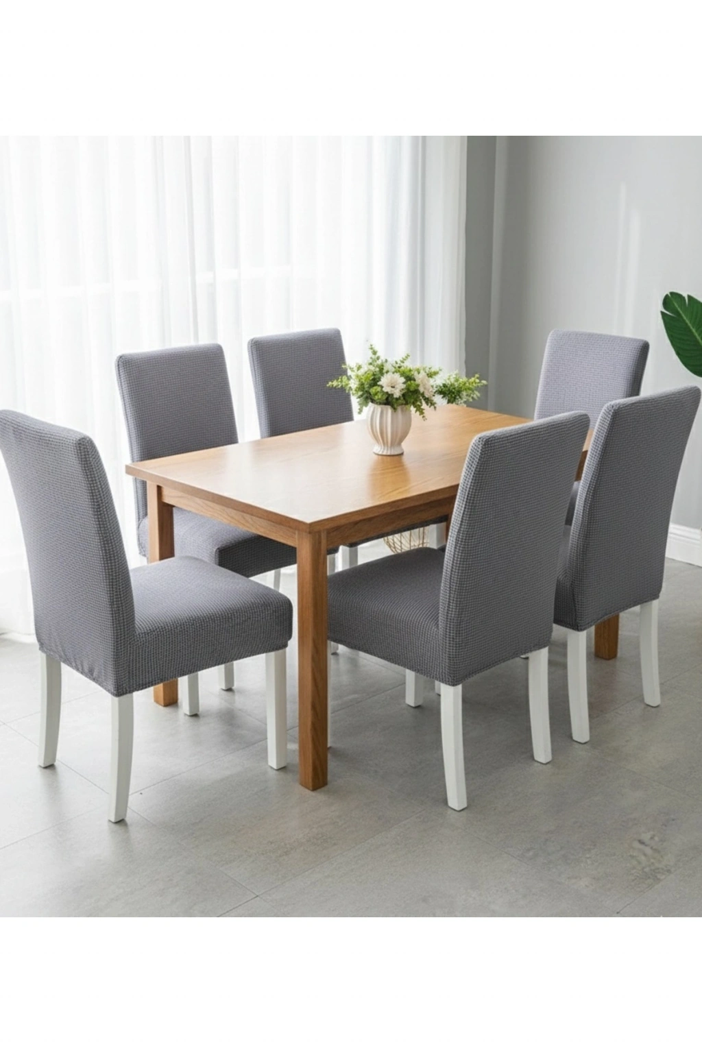 Likralı 6'lı Sandalye Kılıfı Pamuklu Pitikare Yıkanabilir Gri