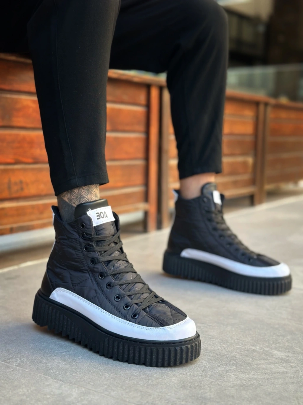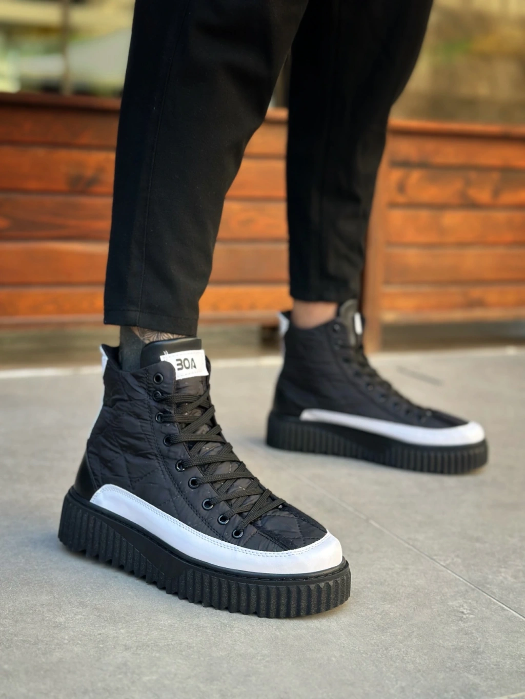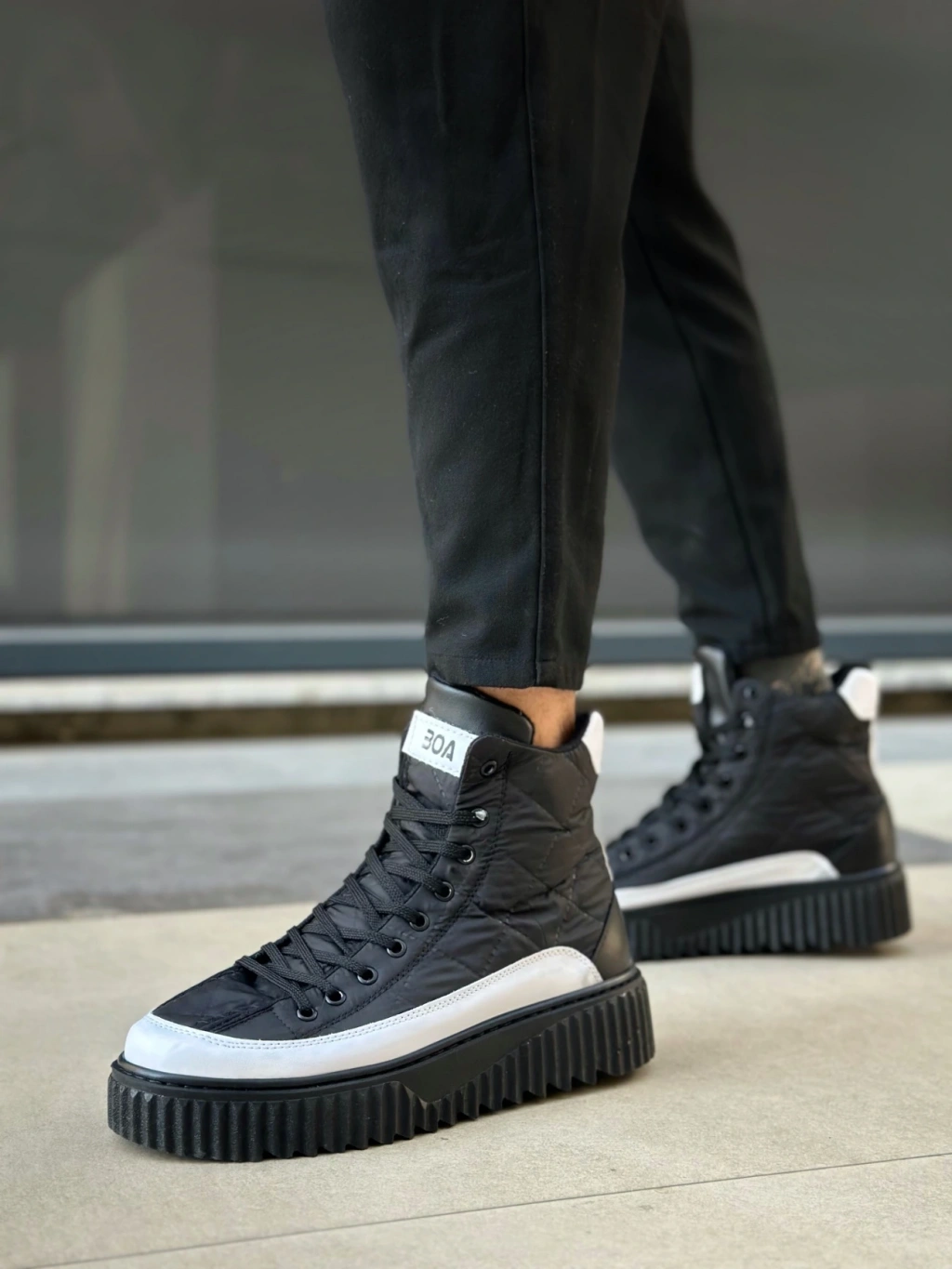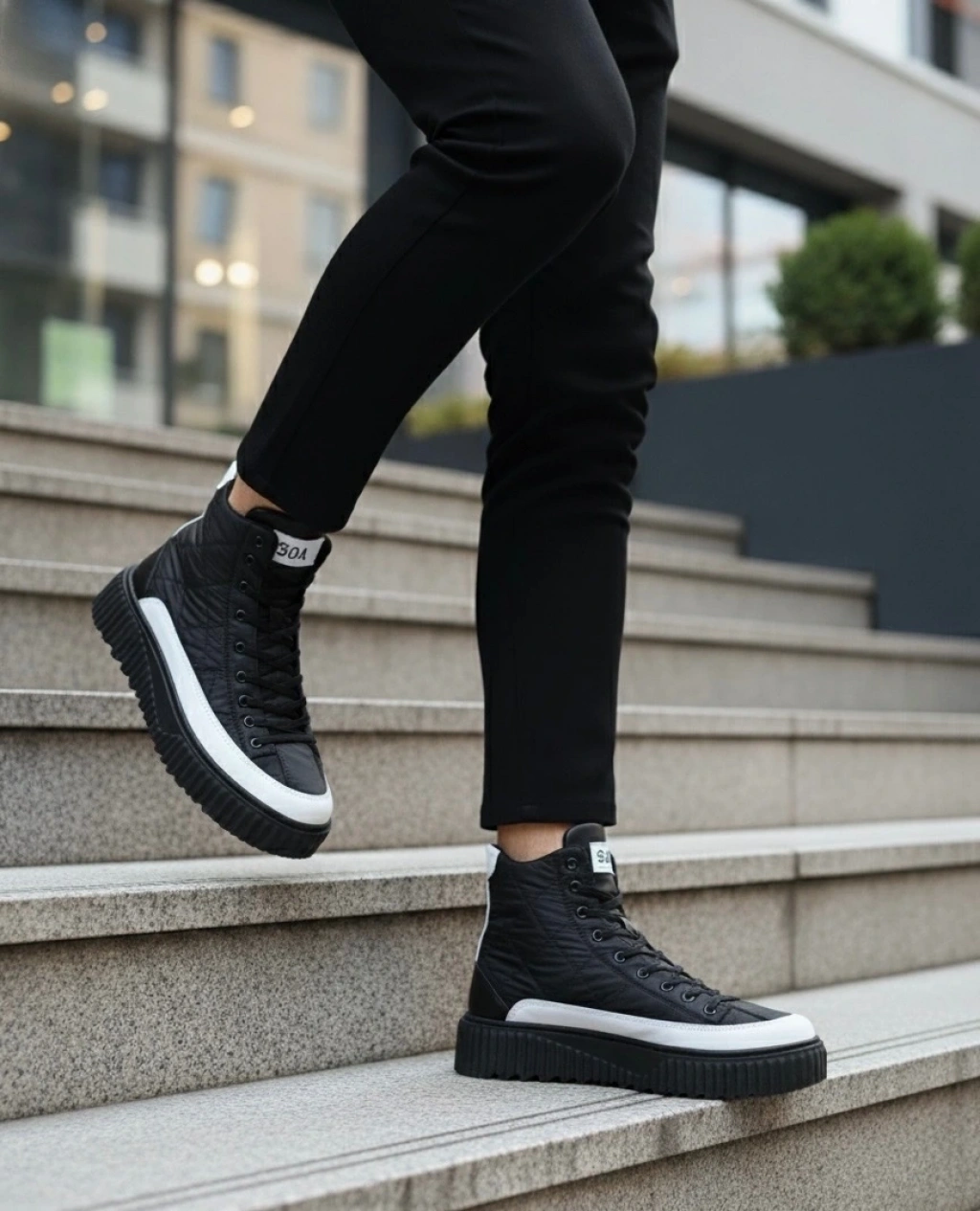 Ba0811 Boa Yüksek Taban Siyah Paraşüt Kumaş Beyaz Cilt Detaylı Yarım Bilek Spor Bot
